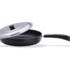The Marbonite finish cookware provides a unique style and elegance with great performance. Our efforts are towards making the Kitchen a smarter place enhancing convenience, reduce time spent & reflect modern lifestyles. Featuring a unique and pleasing design apple shape fry pan from the house of Sumeet Cookware which will surely add beauty to your kitchen. The pure-grade aluminum helps in even heat distribution, thus resulting in uniform cooking of your food items. Perfect for all the passionate of the art of cooking and cuisine. This cookware also features Bakelite handle for a comfortable and secure grip. Ideal to be used on gas stoves but not Induction compatible. Fry pan lid also comes in dome shape adding to its look. Apple dome shape design enables you to fit more food into the pan than a traditional round pan – with extra deep sides. There’s no need for any additional oil or butter, so you can dry-fry to create healthier meals. This fry pan is heavy weight and comes with durable Marbonite interior and exterior nonstick coating. Easy to Clean and Maintain Thanks to the durable material used in the fry pan from Sumeet Cookware, washing and maintaining it is a relatively easy task. Simply use a mild soap detergent and keep it looking new for a long time even with regular use.
