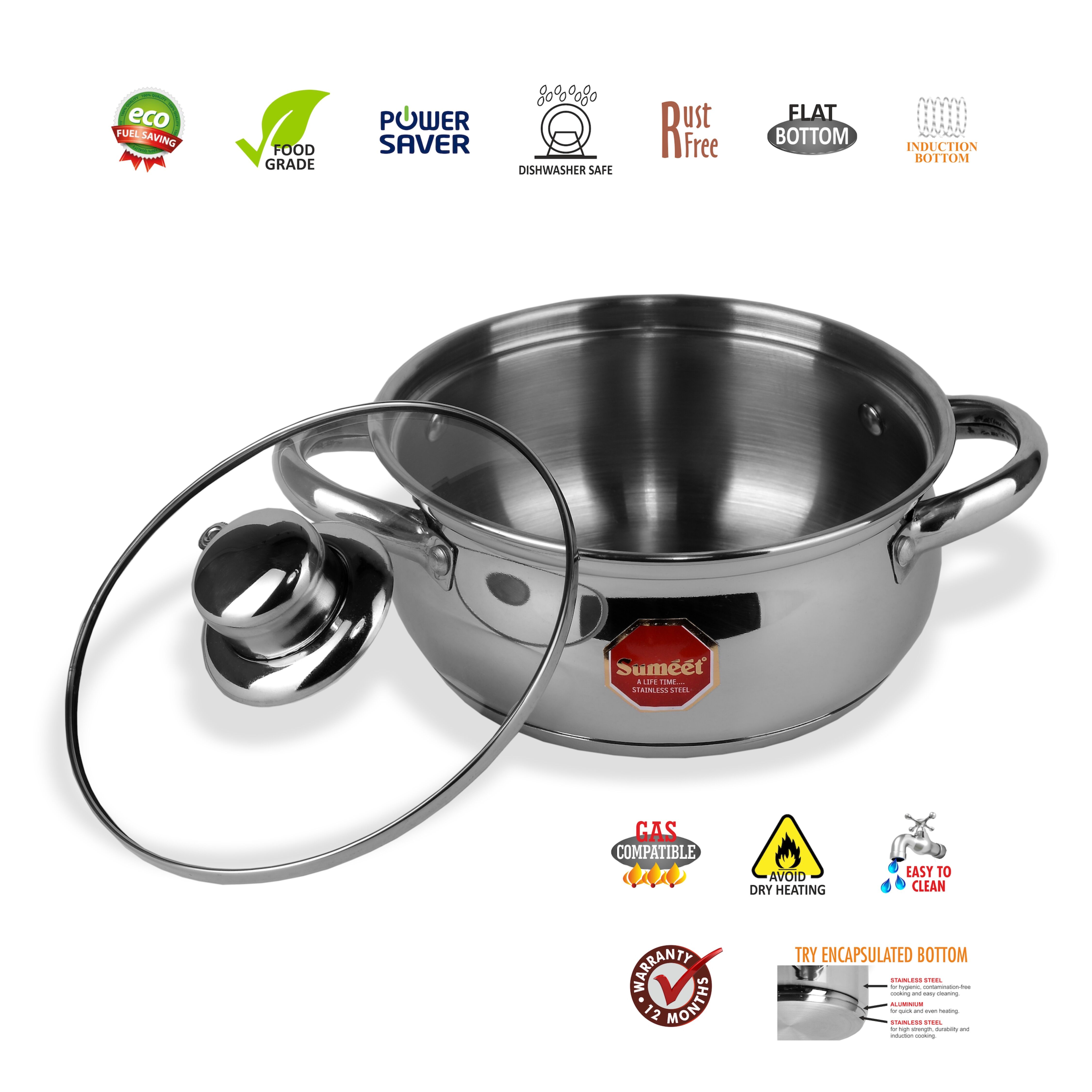 Sumeet Stainless Steel Induction Bottom (Encapsulated Bottom) Induction & Gas Stove Friendly Belly Shape Cook and Serve Casserole No. 9 (1 Ltr) with Glass Lid