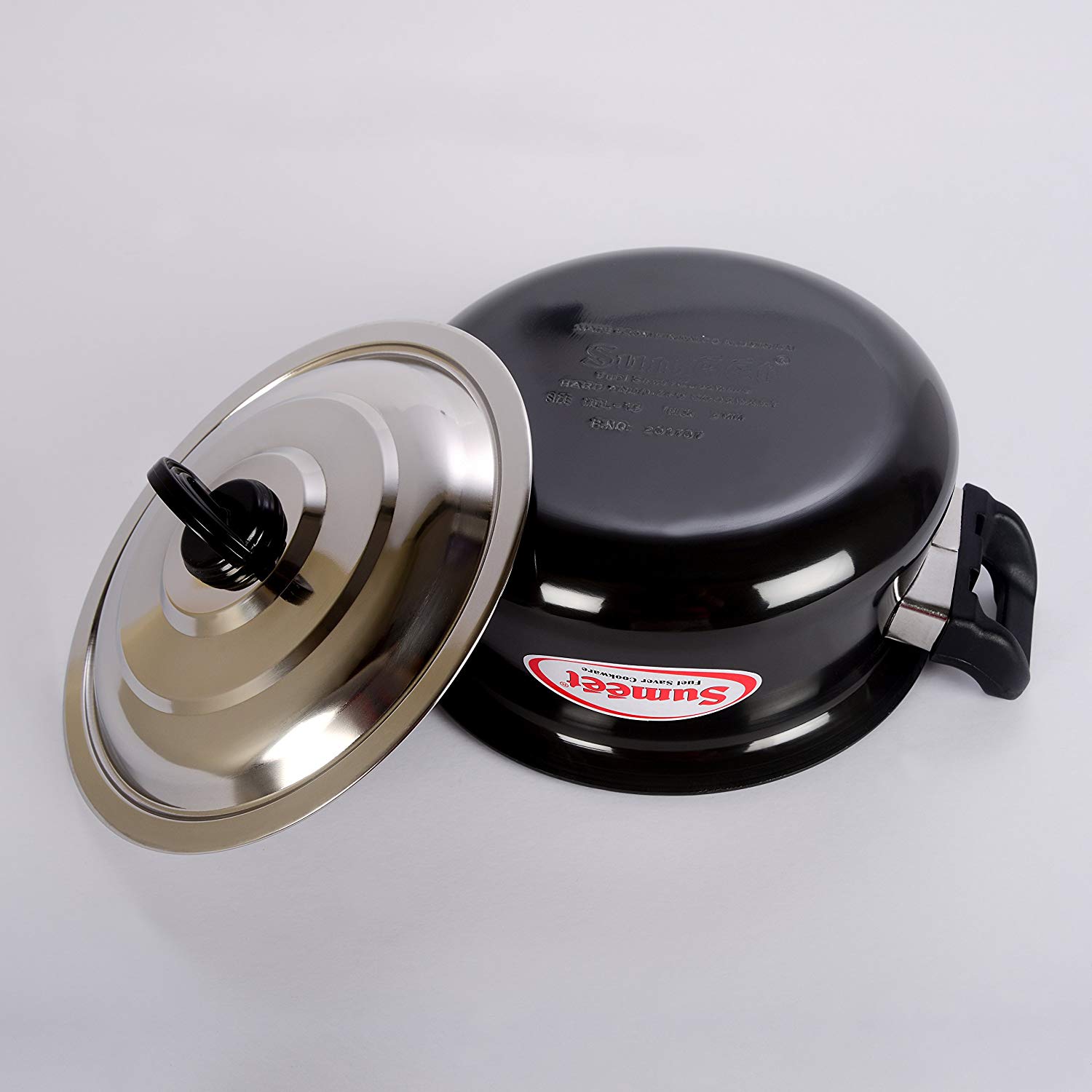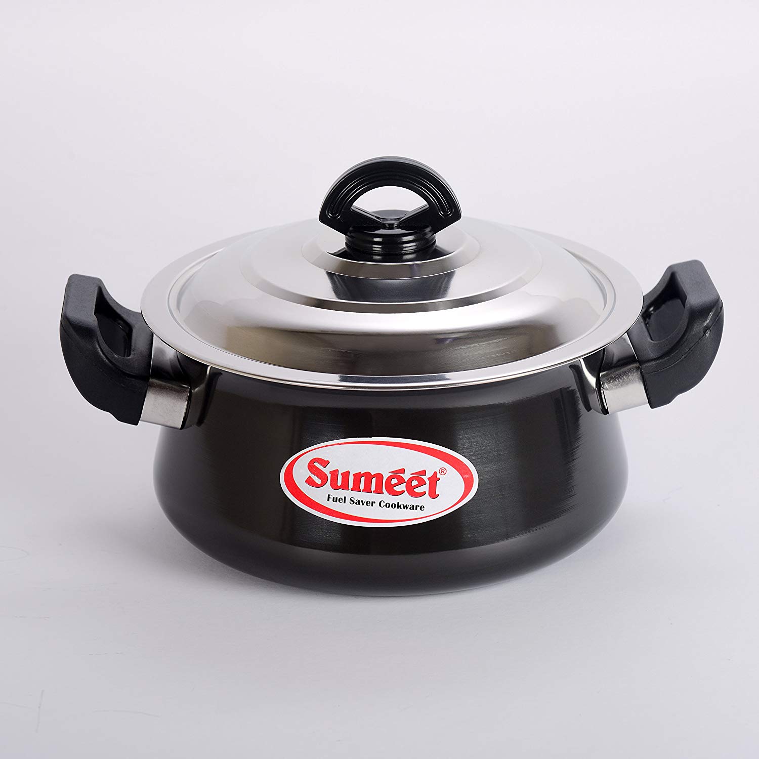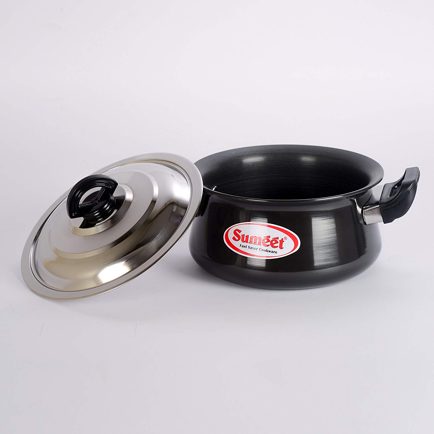 Stunning Design and an extremely sturdy body, the Sumeet Hard Anodized Handi With Stainless Steel Lid adds to the overall decor of your kitchen space. This Handi has been beautifully designed to add grace to your dining experience. The unique design of handi ensures even distribution of heat, thus avoiding burning of food and providing a more fuel-efficient solution for your cooking needs. Ideal to be used on gas stoves but NOT Induction compatible. Along with being perfect utensils for cooking food, it can also be used to serve your meals in a stylish manner. This Handi set cook and serve ware is stylish and beautiful to look at. It is durable and made of high quality Aluminum material. This Handi can be used for storing, cooking, mixing or serving food items.